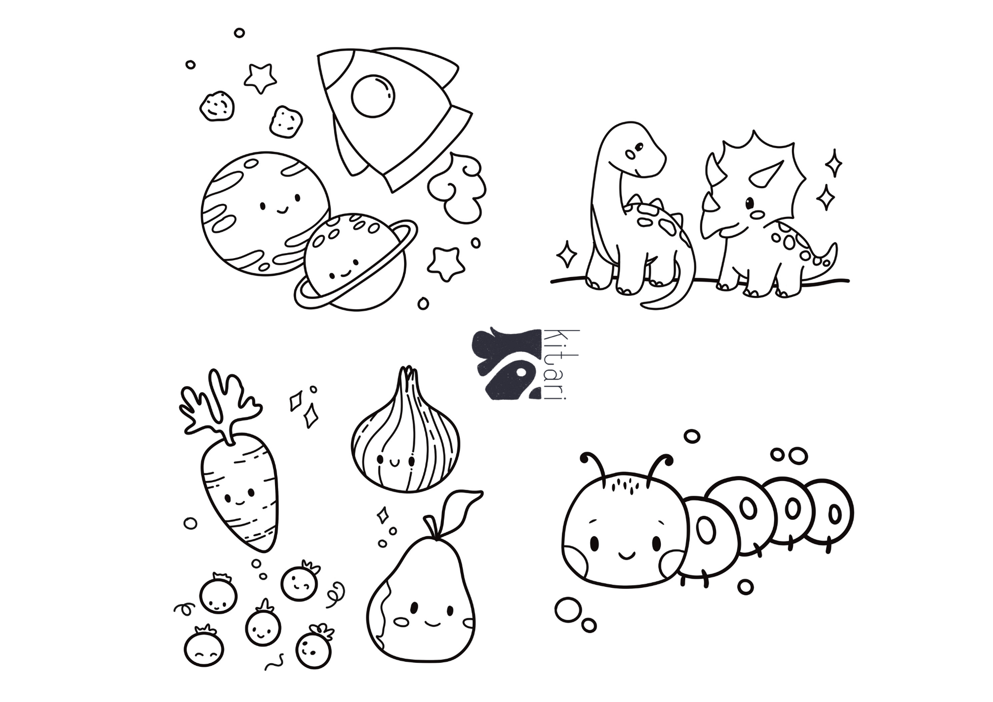 14 kreative Seiten mit handgezeichneten Ausmalmotiven – inspiriert von der Tierwelt, Natur und Lebenswelt der Kinder.
